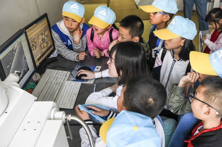 Gu Qiyue, anggota staf Institut Ekologi dan Geografi Xinjiang di bawah naungan Akademi Ilmu Pengetahuan Tiongkok, menjelaskan pengetahuan sains kepada anak-anak yang berkunjung dalam acara Hari Sains Publik ke-15 akademi tersebut di Urumqi, Daerah Otonom Uighur Xinjiang, Tiongkok barat laut, pada 19 Mei 2019. (Xinhua /Wang Fei)