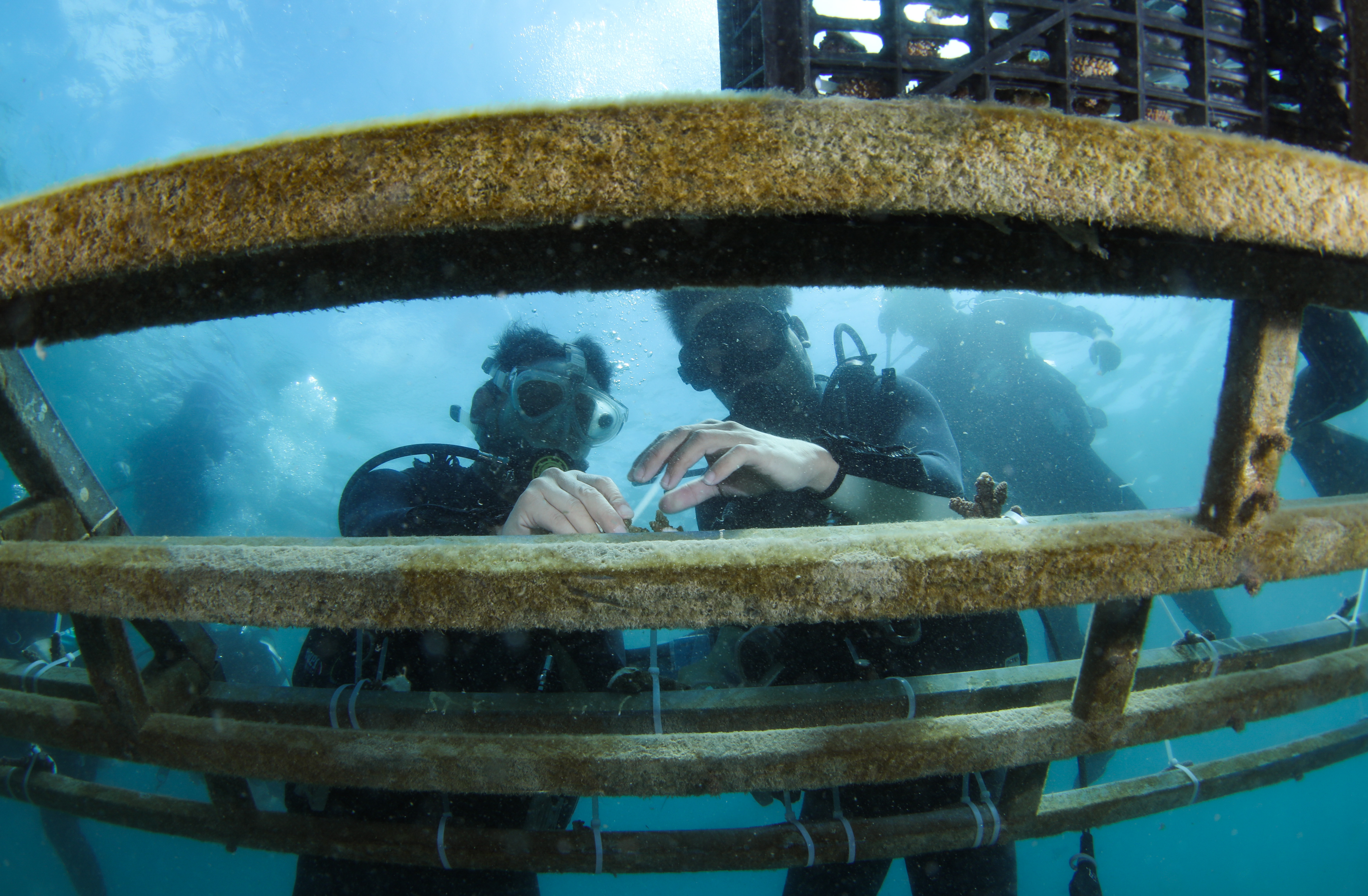 (230528) -- LINGSHUI, China, 28 Mei, 2023 (Xinhua) -- Para penyelam melakukan transplantasi terumbu karang di perairan Pulau Fenjiezhou di Provinsi Hainan, China selatan, pada 27 Mei 2023. (Xinhua/Yang Guanyu)