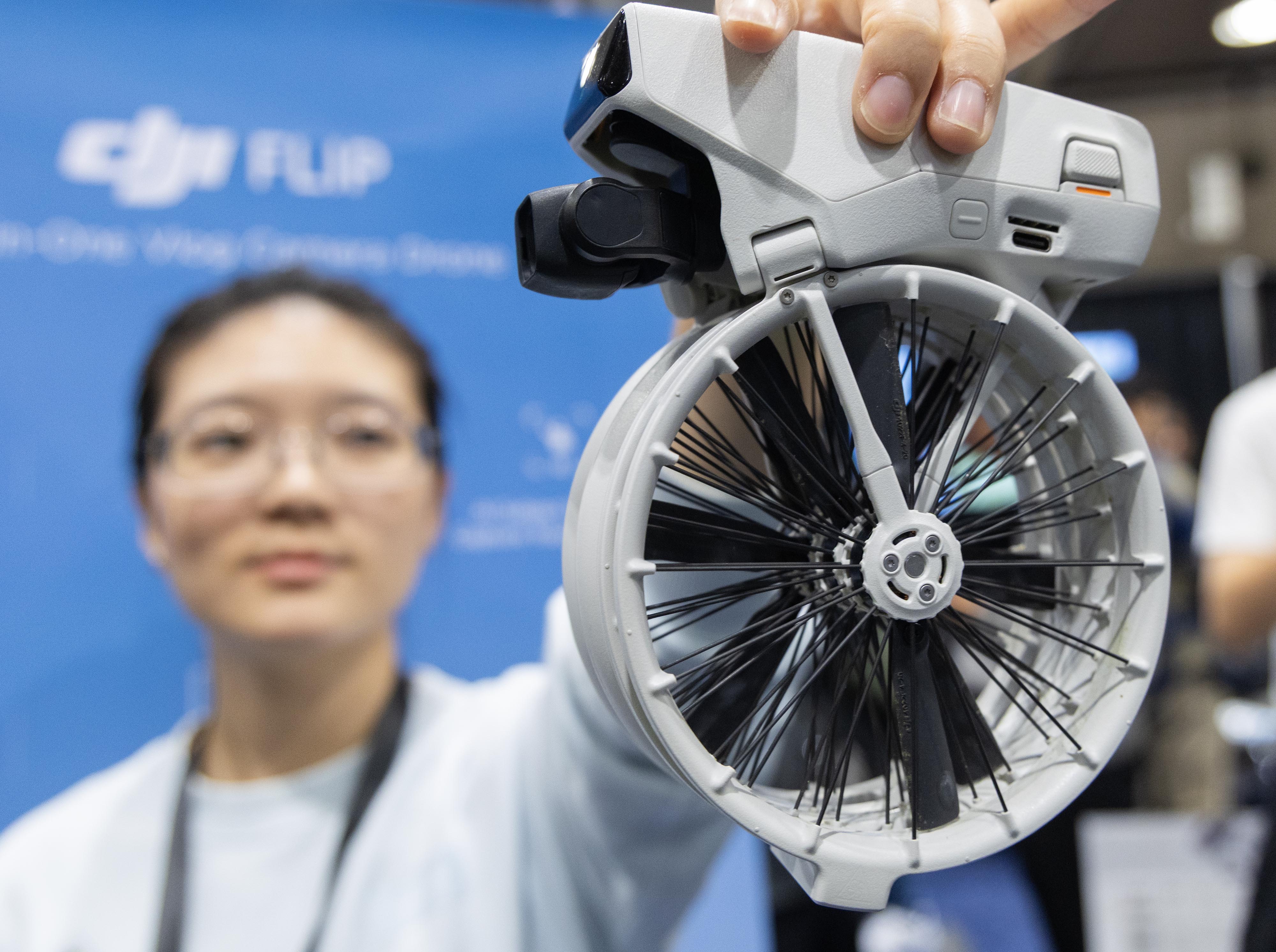 Seorang staf menunjukkan sebuah drone DJI Flip dalam ajang ProFusion Expo 2025 di Toronto, Kanada, pada 5 November 2025. (Xinhua/Zou Zheng)