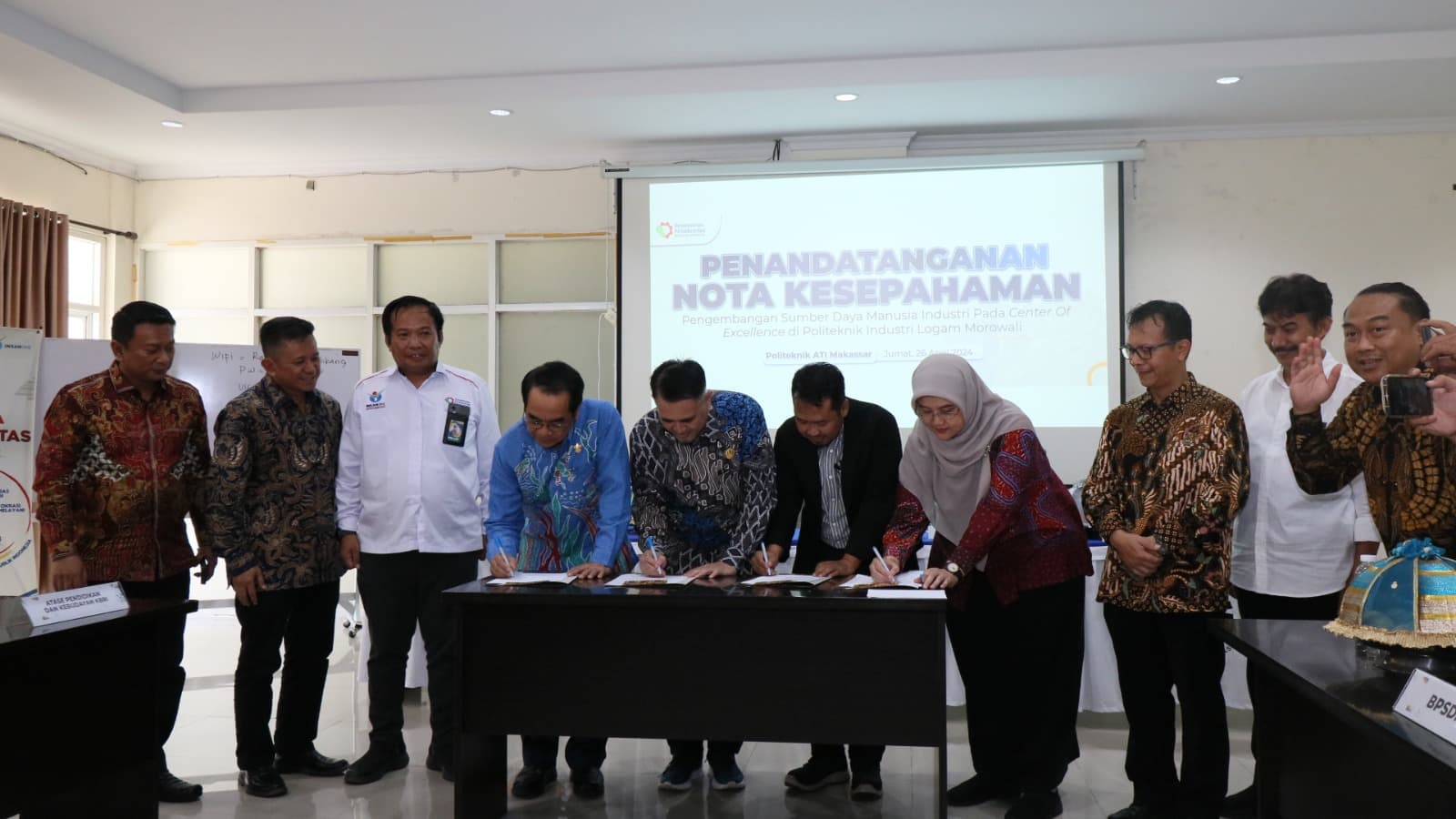 PT IMIP bersama empat perguruan tinggi di Sulawesi Selatan dan Sulawesi Tengah menandatangani MoU kerja sama pengembangan sumber daya manusia (SDM) di bidang industri di Politeknik ATI Makassar pada 4 Mei 2024. (Sumber: PT IMIP)
