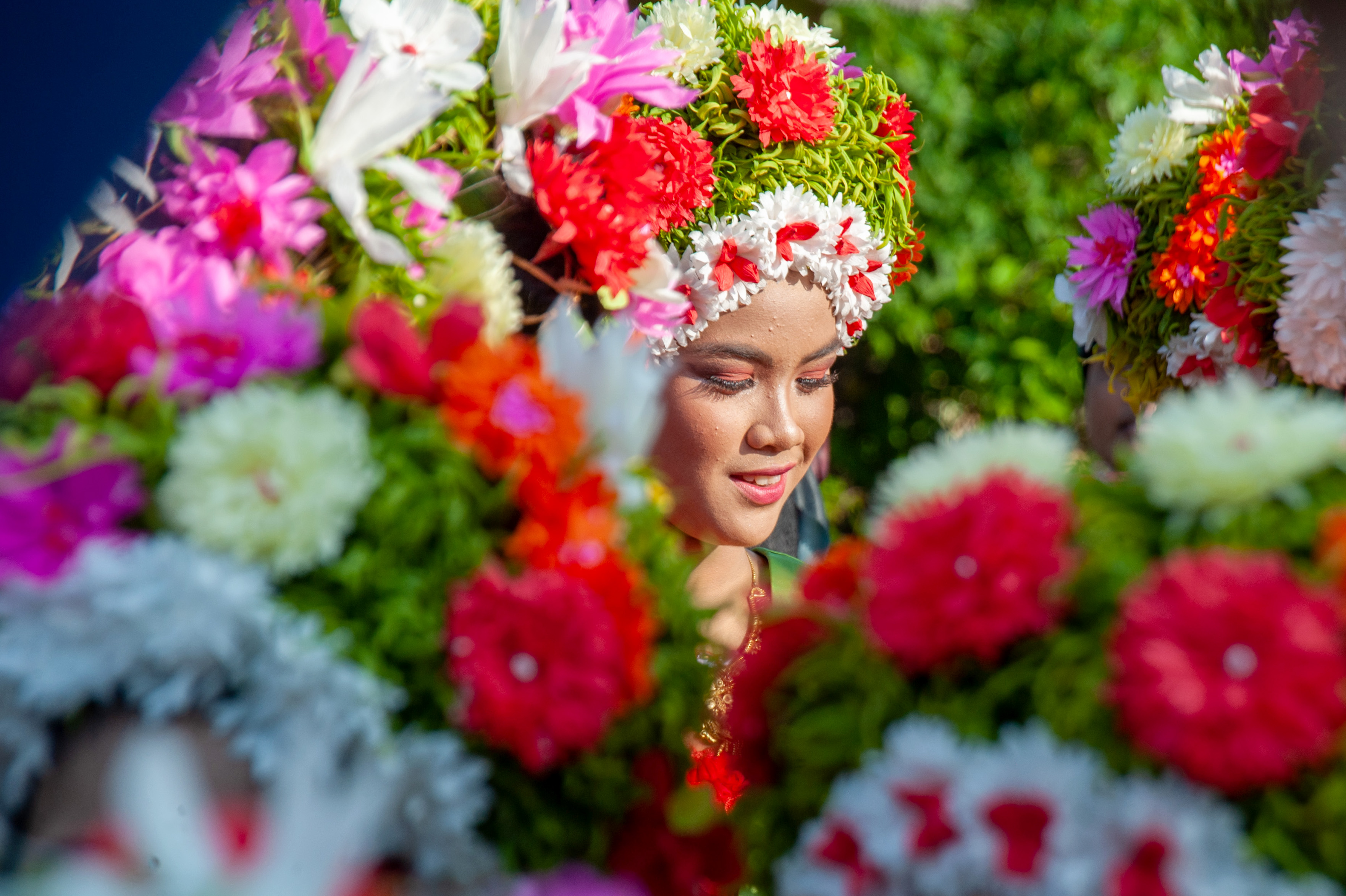 (231213) -- INDRAMAYU, 13 Desember, 2023 (Xinhua) -- Seorang perempuan yang memakai hiasan bunga di kepala berpartisipasi dalam perayaan festival tradisional Ngarot di Desa Lelea, Kabupaten Indramayu, Provinsi Jawa Barat, pada 13 Desember 2023. Ngarot merupakan upacara tradisional di Indramayu, Provinsi Jawa Barat, yang digelar untuk menyambut musim tanam padi. (Xinhua/Septianjar Muharam)