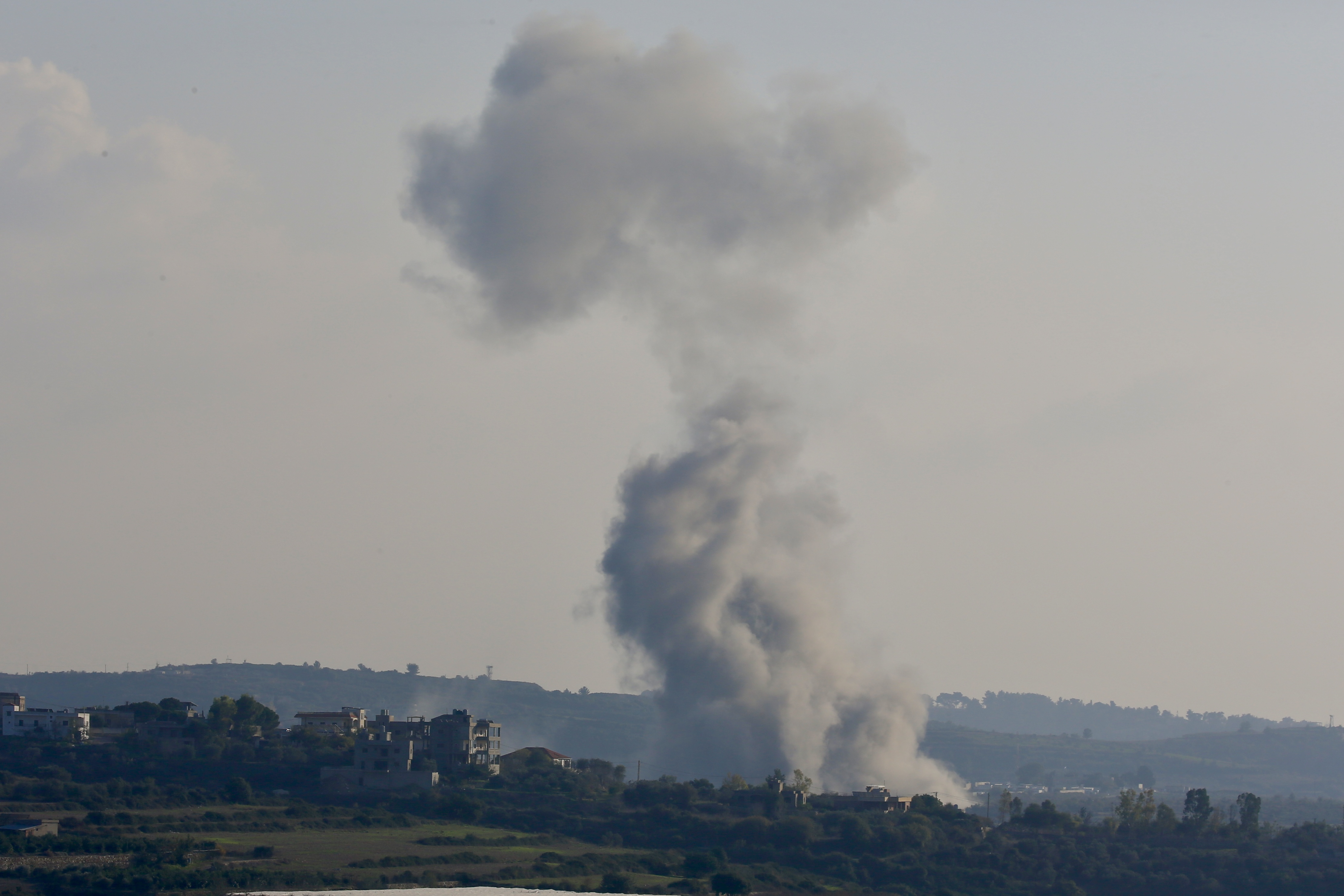 (231218) -- TAYR HARFA, Lebanon, 18 Desember, 2023 (Xinhua) -- Asap membubung tinggi pascaserangan udara Israel di Tayr Harfa, Lebanon, pada 18 Desember 2023. Seorang pejuang Hizbullah tewas dan seorang warga sipil terluka pada Senin (18/12) dalam konfrontasi di perbatasan Lebanon-Israel, menurut sumber militer Lebanon. (Xinhua/Ali Hashisho)