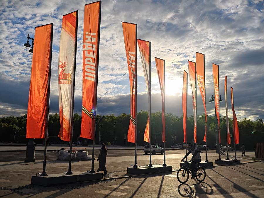 Dekorasi Hari Kemenangan (Victory Day) terlihat di Moskow, Rusia, pada 6 Mei 2025. (Xinhua/Zhang Ling)