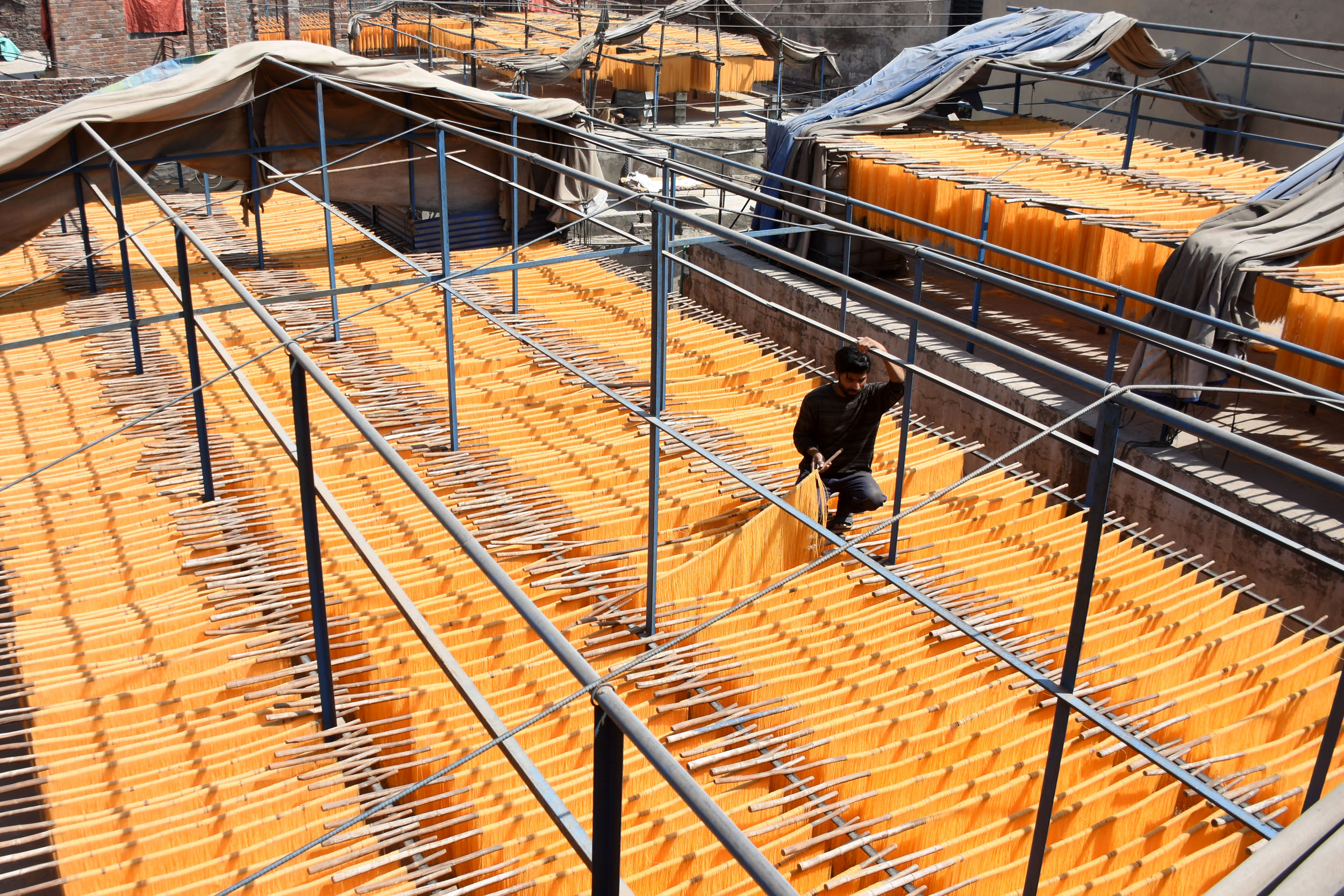 (250326) -- LAHORE, 26 Maret, 2025 (Xinhua) -- Seorang pekerja menata untaian bihun di sebuah pabrik yang berada di Lahore, Pakistan, pada 25 Maret 2025. Bihun merupakan makanan yang populer dan kerap dijadikan menu untuk berbuka puasa selama bulan suci Ramadan di Pakistan. (Xinhua/Sajjad)