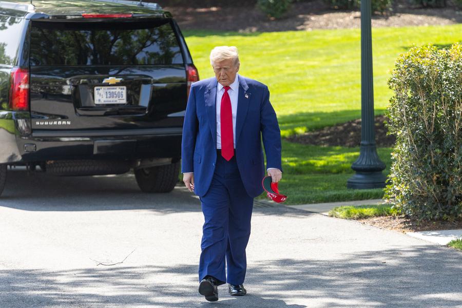 Presiden Amerika Serikat (AS) Donald Trump berjalan menuju awak media sebelum menaiki Marine One di South Lawn (Halaman Selatan) Gedung Putih di Washington DC, AS, pada 29 April 2025. (Xinhua/Hu Yousong)