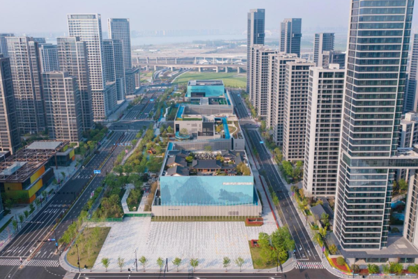 Keseluruhan bangunan mengambil bentuk pegunungan dan sungai dari Dwelling in the Fuchun Mountains dan tekstur serta warna dari seladon Hangzhou dan batu giok kuno Liangzhu.