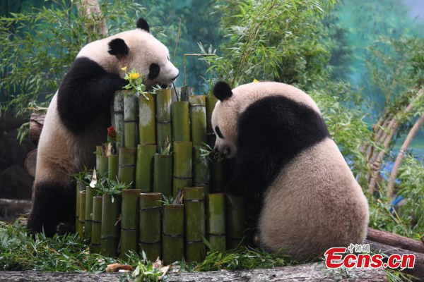 Panda raksasa Chun Sheng dan Xiang Guo makan bambu di Kebun Binatang Hangzhou di Provinsi Jiangsu, China timur, 18 Agustus 2023. (Foto: China News Service/Wang Gang)