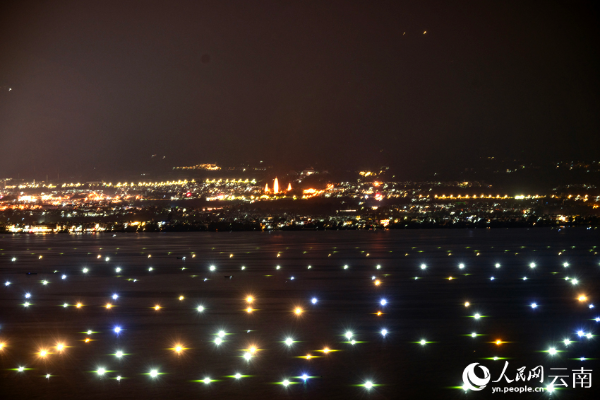 Beijing, Bolong.id - Dengan ribuan lampu pemancingan ikan di permukaan Danau Erhai, Prefektur Otonomi Dali Bai, Provinsi Yunnan, Tiongkok barat daya, pemandangan malam sangat indah.