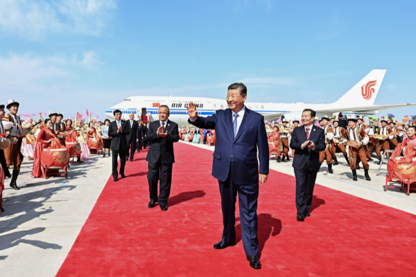 Saat menuruni jalan setapak, Xi menerima bunga dari anak-anak dan disambut dengan lagu dan tarian yang dibawakan oleh orang-orang dari berbagai kelompok etnis.