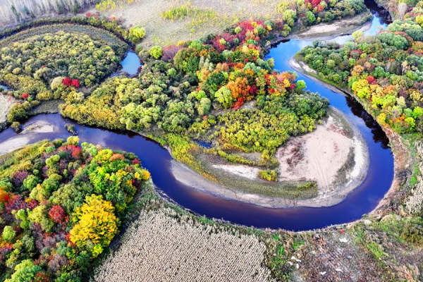 Di daerah pedesaan Hailun, kota setingkat kabupaten di bawah Suihua, sungai yang berkelok-kelok mengalir di antara tepian yang dipenuhi pepohonan yang menampilkan corak warna merah, kuning, jingga, dan hijau kanvas alam yang penuh dengan warna.